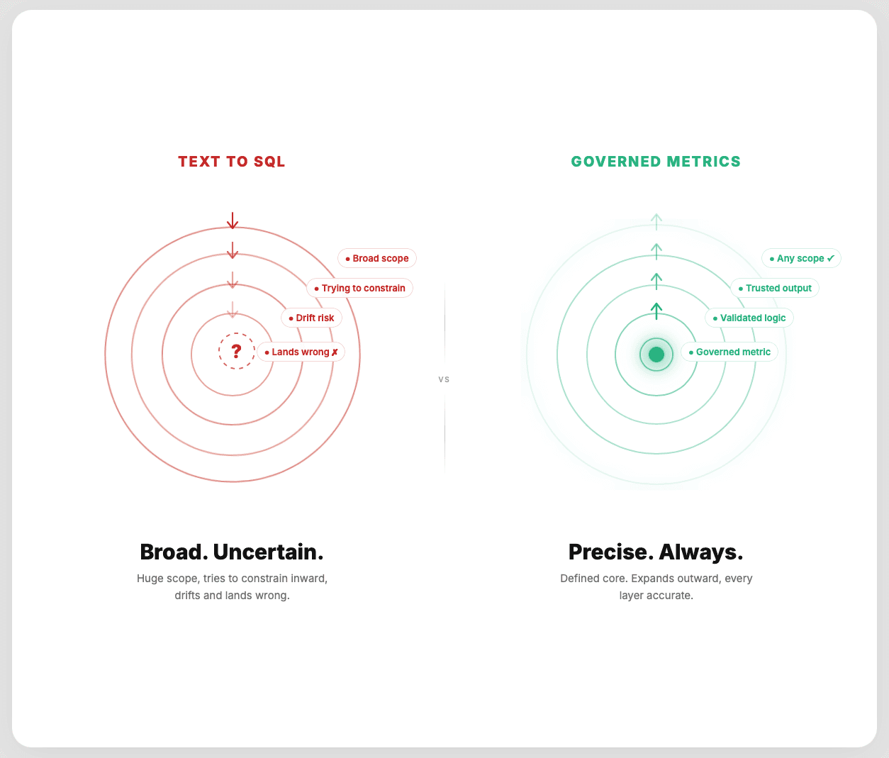 Define rules-based lego blocks for the AI to use. Governed Metrics are deterministically compiled to SQL.