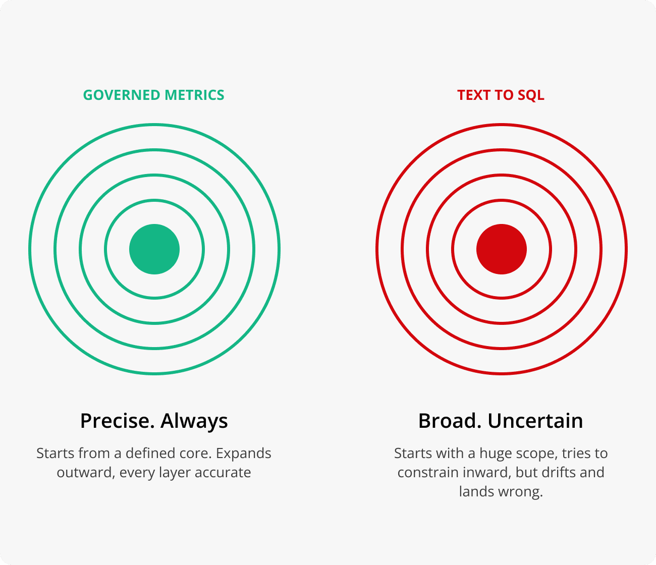 Define rules-based lego blocks for the AI to use. Governed Metrics are deterministically compiled to SQL.